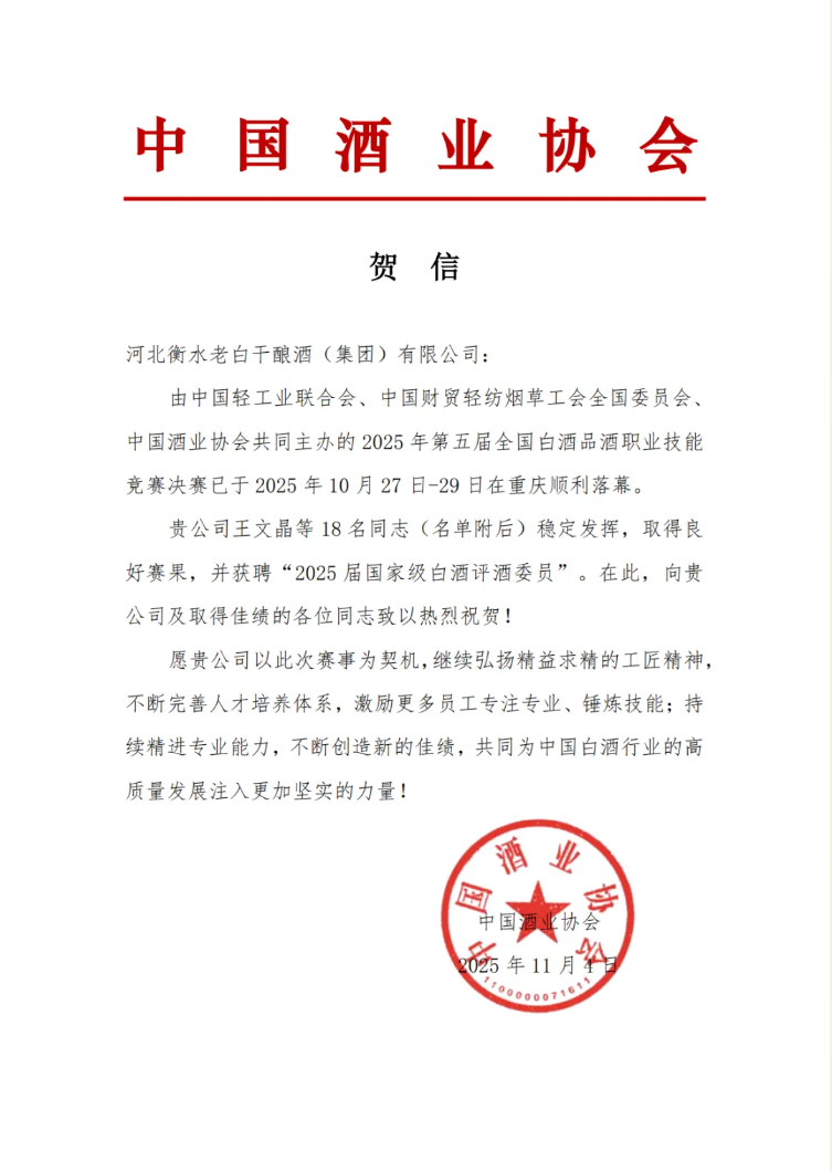 近日,中國酒業(yè)協(xié)會發(fā)來賀信。在2025年第五屆全國白酒品酒職業(yè)技能競賽決賽中,衡水老白干及旗下四家子公司(河北衡水老白干酒業(yè)股份有限公司、承德乾隆醉酒業(yè)有限責任公司、湖南武陵酒有限公司、安徽文王釀酒股份有限公司)的十八名技術精英憑借深厚的專業(yè)素養(yǎng)和卓越的品評技能,從眾多參賽者中脫穎而出,成功獲得“國家級白酒評酒委員”的殊榮!